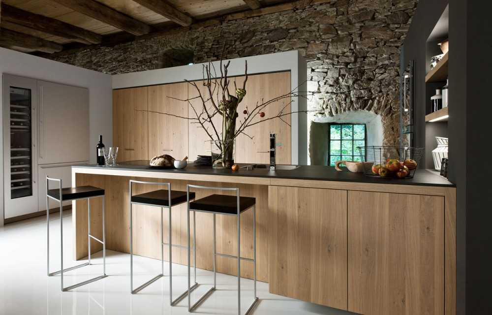 Вне зависимости от стиля оформления кухни не будет ошибкой установить в этом помещении барную конструкцию к стеклянной столешнице или основанию, имитирующему каменную кладку.