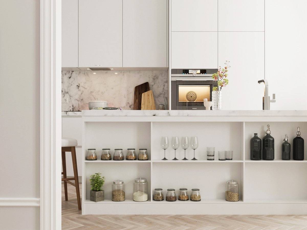 Для маленькой кухни вы можете добавить мраморные или деревянные акценты для столешниц. Минималистская кухня должна быть максимально воздушной, без экстравагантных украшений, но вы можете добавить неожиданный элемент, например, в ящики. Мебель, подходящая для минималистского стиля, не имеет специальных ручек, поэтому вы даже можете выбрать ящики и шкафы, которые открываются сами по себе.