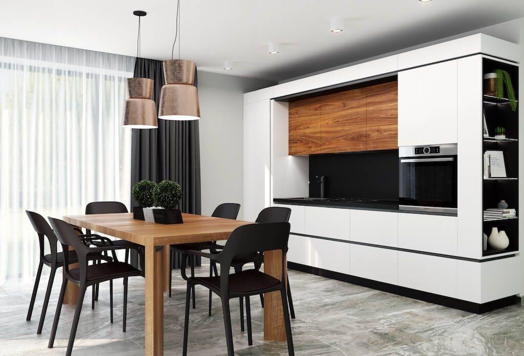 Бело-черные кухни — это модно и стильно. Белый гарнитур с темной столешницей, например, отлично будут смотреться в кухнях разных стилей. Это подойдет и для классики, и для минимализма.
