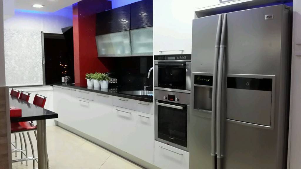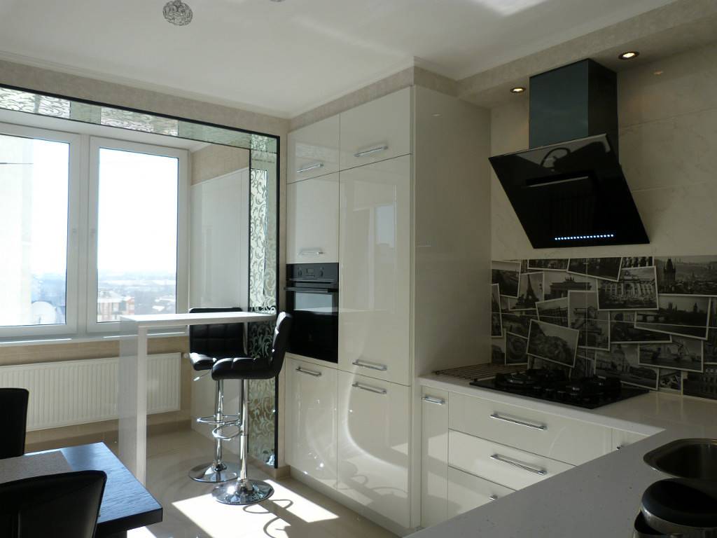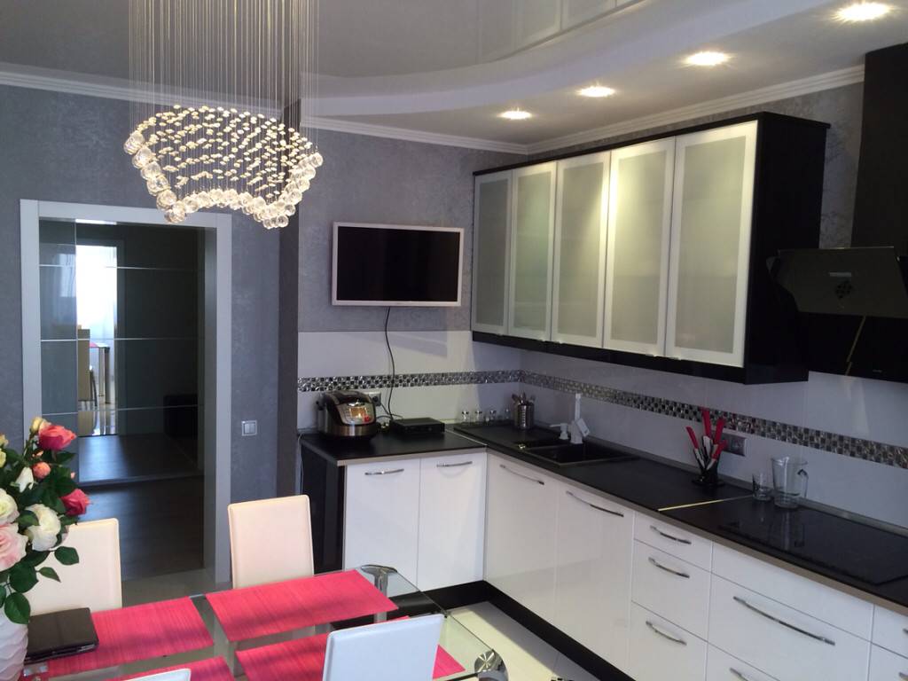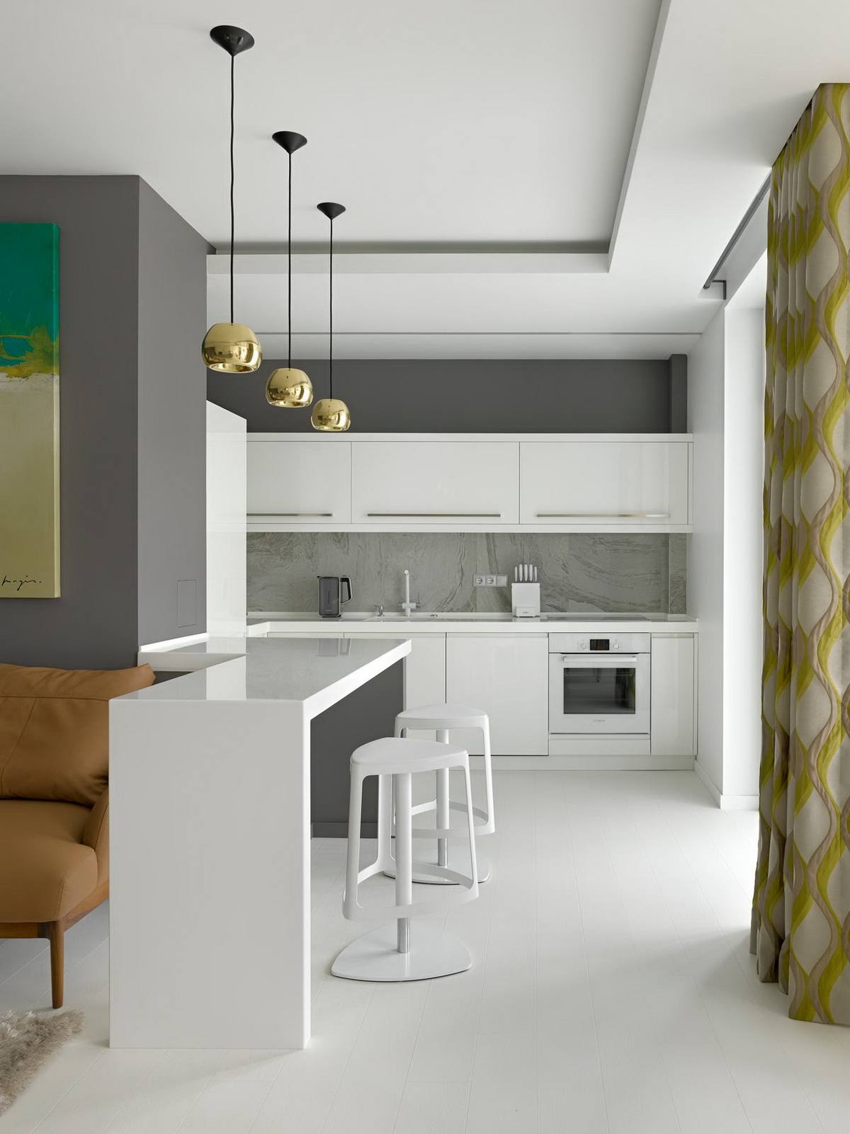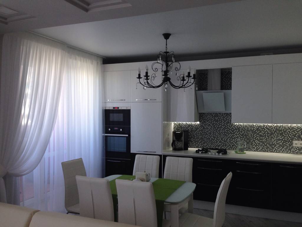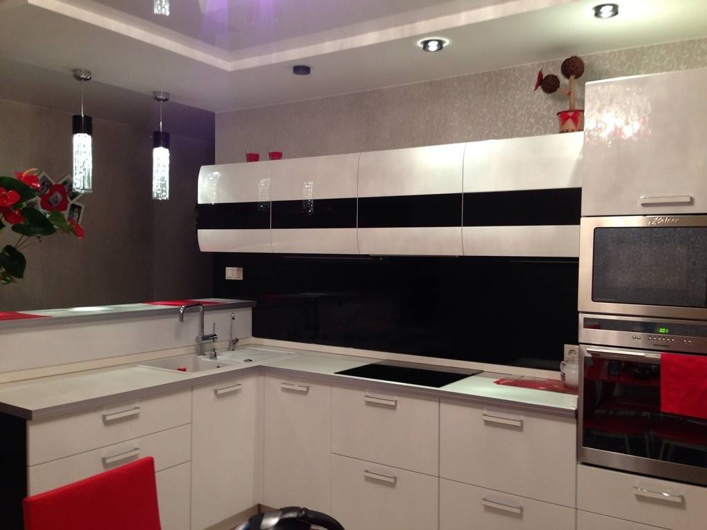 Монохромная кухня элегантно смотрится, если мебель будет белой, а фартук черным. Также встроенная светодиодная подсветка украсит помещение. Белые поверхности кухонной мебели отражают свет, поэтому визуально помещение становится просторнее, что является плюсом.