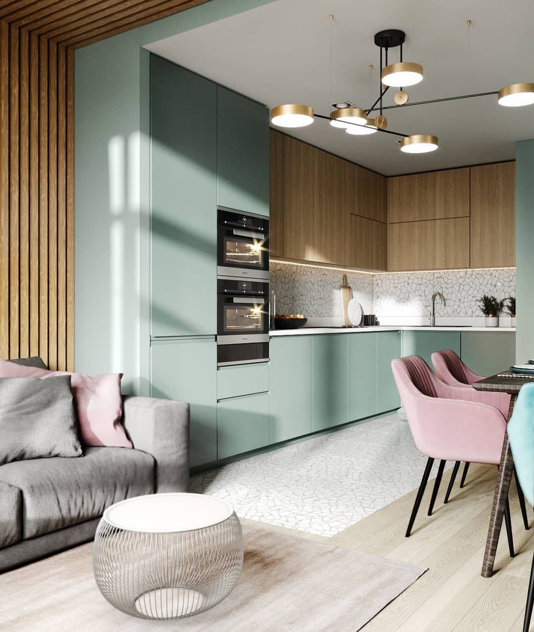 Зеленый цвет, несомненно, сделает кухню более «аппетитной», ведь это цвет яблок, огурцов, авокадо, оливок, шпината.
