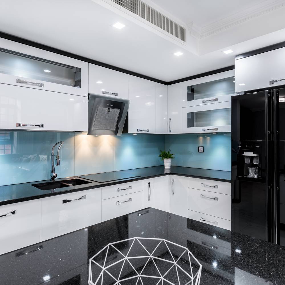 Черными могут быть некоторые элементы фасадов, кухонный фартук, пол. Главное, чтобы доминирующим оставался именно белый цвет, а черный только подчеркивал его чистоту и совершенство.