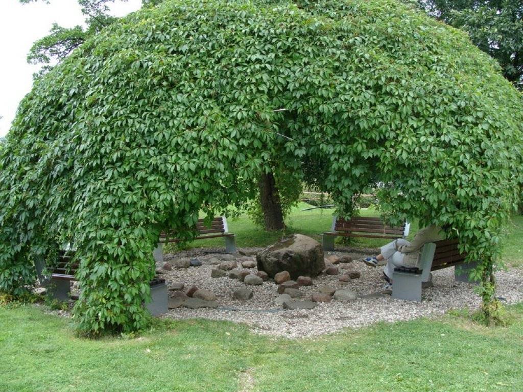 Для устройства “живой” беседки отлично подходит девичий виноград, который уже через несколько лет после посадки буквально заполонит отведенный ему каркас