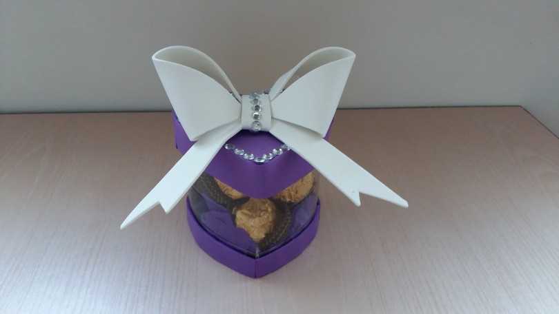 На листе фоамирана обводим заготовку по контуру. Смазываем клеем границы. Даем сцепиться. Переходим к крышке. Технология такая же, как и у донышка. Только необходимо добавить бортики из небольших полос. Украшаем изделие стразами. Присоединяем атласную ленту. Теперь без забот вы сможете подарить любой сувенир, можно преподнести красивые часы.