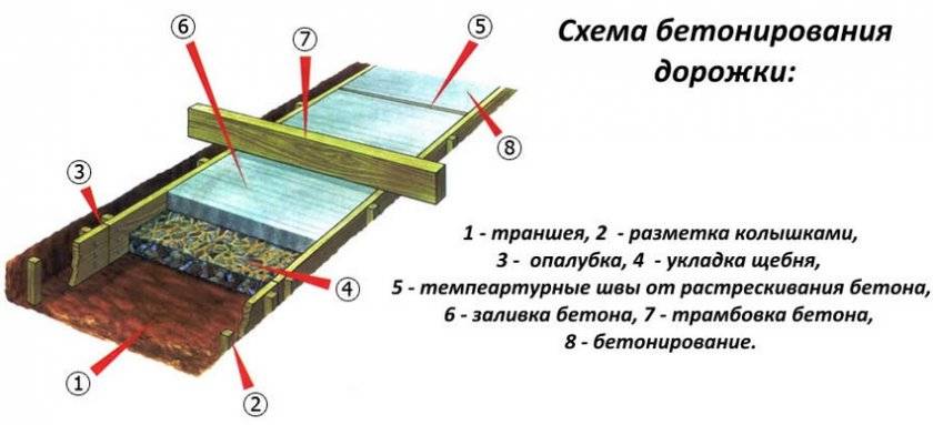 Здесь, как и других методах, потребуется: цемент, вода, песок, щебень. Из инструмента: мастерок, уровень, заливочная форма. Как залить бетонную дорожку: