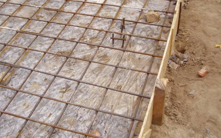 Чтобы компенсировать эксплуатационную нагрузку на бетон, прибегают к помощи арматуры. Она укладывается между слоями с применением специальных фиксаторов. При использовании армированной конструкции бетонное основание может быть меньше, а без неё — 15 см. Наличие элементов не гарантирует, что по бетону не пойдут трещины, но увеличивает его срок эксплуатации. После укладки арматуры можно заливать бетонный раствор.