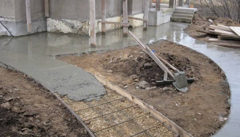 Когда основание дорожки полностью подготовлено, можно приступать к непосредственной заливке бетона. Его можно замесить самостоятельно или же заказать в строительной компании, если речь идет о большом объеме
