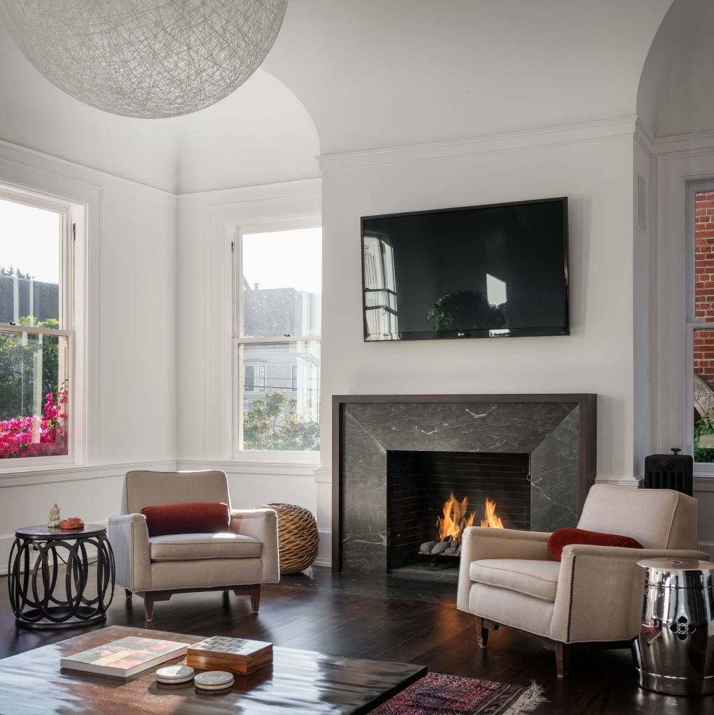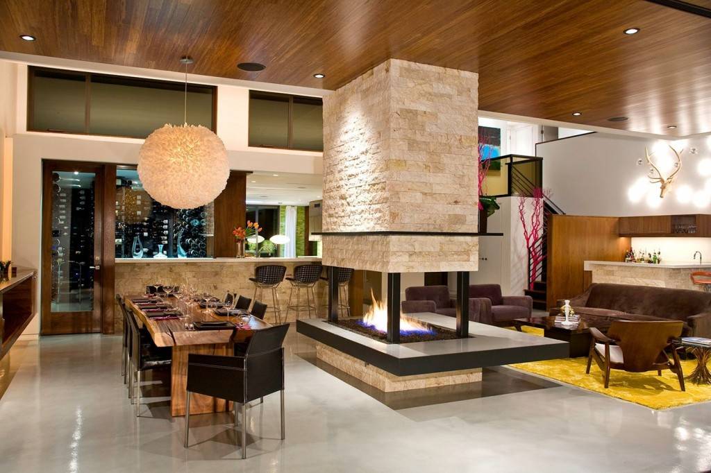 Композиционный центр квартиры — камин с необычной конструкцией, которая не утяжеляет пространство