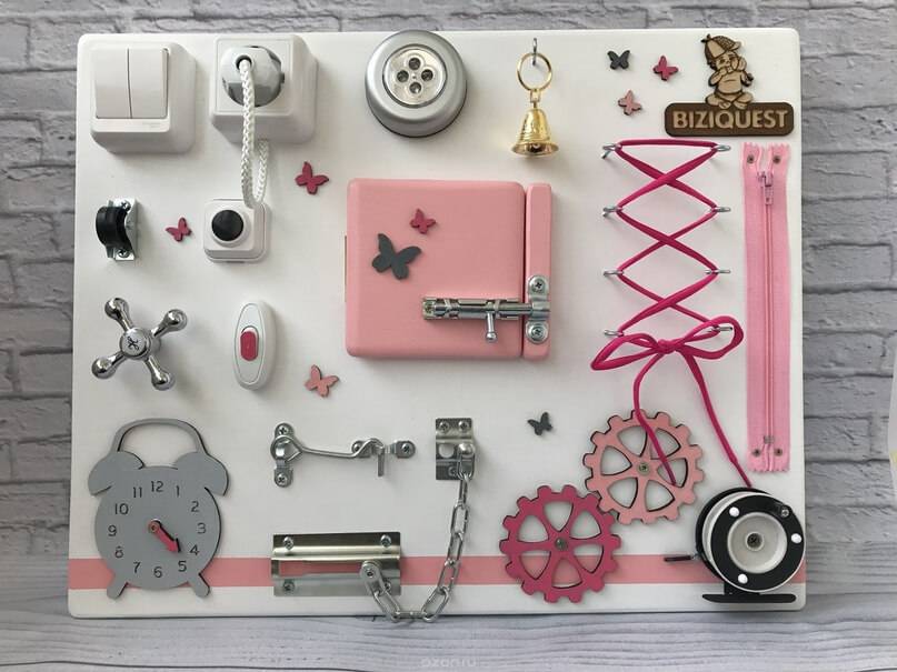 СоветНа бизиборде можно закрепить все, что привлекает внимание ребенка. Набор элементов развивающей доски зависит от сложности, цены готовой игрушки, возраста ребенка или его пола.. Для девочек доски делают как для игр с куклами, для мальчиков – размещают больше технических деталей