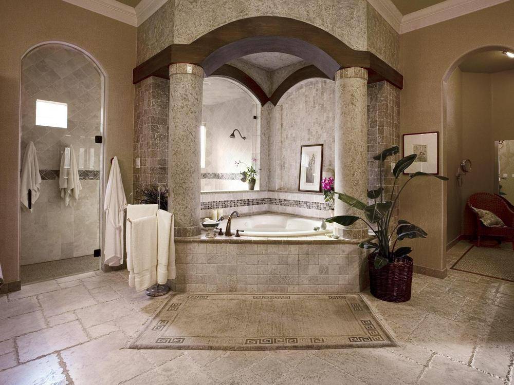 Большую угловую ванну можно оборудовать сводом с колоннами в античном стиле