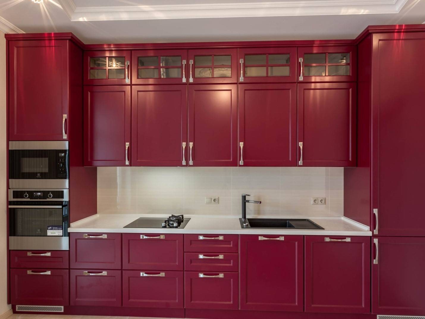 Если вы не хотите делать кухню в двух оттенках, но при этом стремитесь придать ей уникальности, то можно поискать интересные однотонные фасады с красивым орнаментом или рамками. Также оригинально смотрится сочетание бордовых и стеклянных дверок. Это может быть матовое стекло или прозрачное с красивым узором.