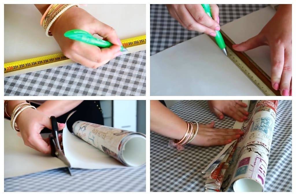 - Расстелите перед собой обои. Вырежьте прямоугольник согласно полученным размерам. В процессе разрезания следите за тем, чтобы рисунок не исказился. Чтобы материал не сворачивался, закрепите его тяжелой книгой или скотчем.