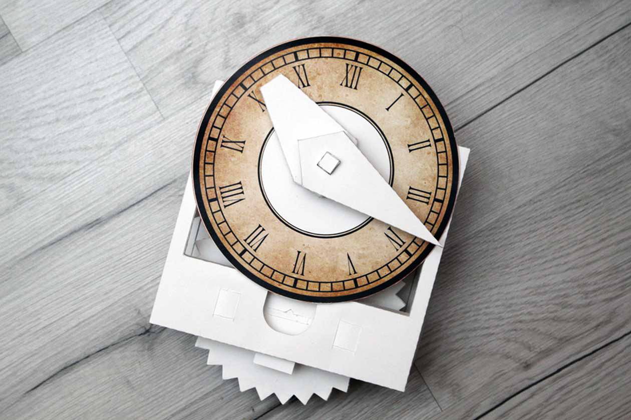 Осталось только собрать все детали в единый механизм. Для этого уже имеющиеся вырезанные цифры приклеивают на циферблат в отмеченных местах. После чего след от простого карандаша можно подтереть ластиком.