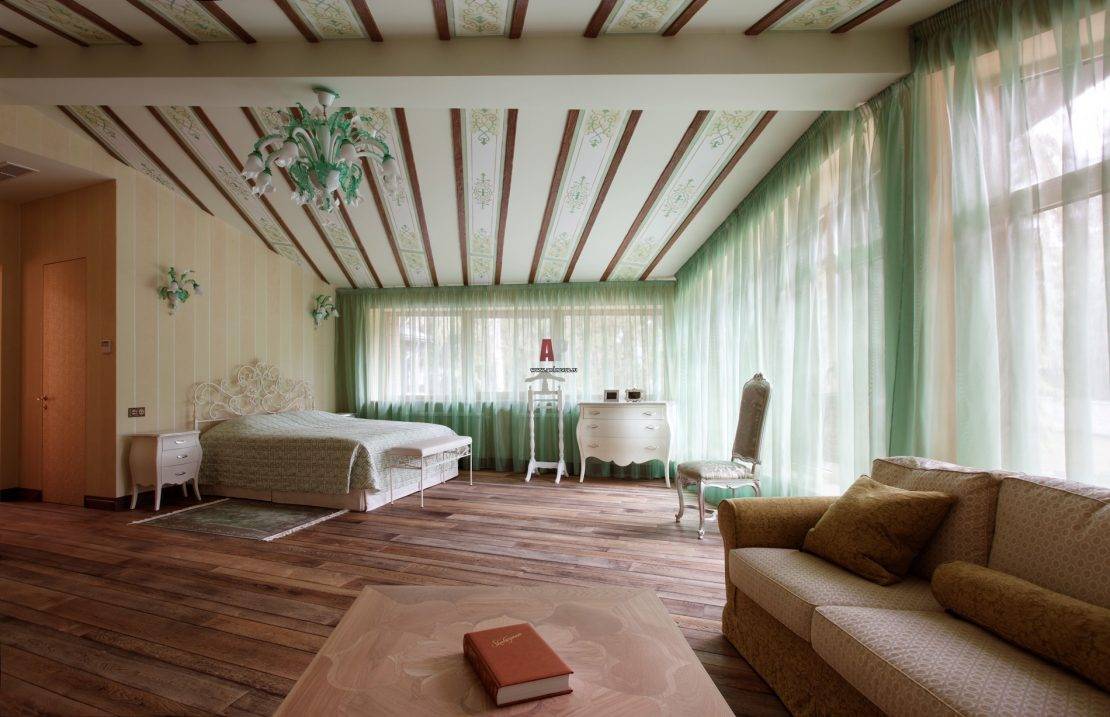 В оформлении потолочных поверхностей используется два разных подхода к использованию стиля, дизайн выбирается с учетом особенностей постройки домика на местности. Если дача деревянная или выстроена из кирпича, природного камня, то чаще всего для оформления потолочной поверхности выбирается стиль Кантри, Прованс или Шале.