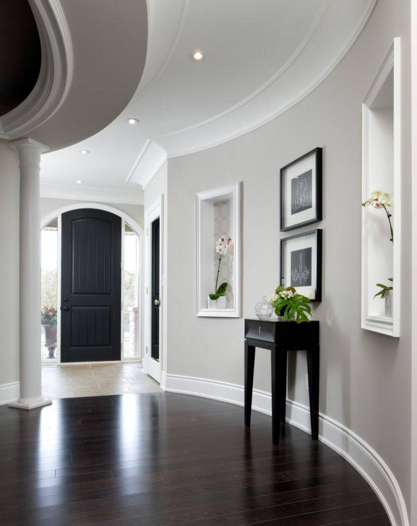 Черные обои или потолок в прихожей смотрятся очень стильно и элегантно. Это не значит что нужно делать темным исключительно все помещение.