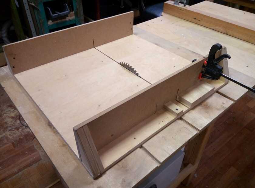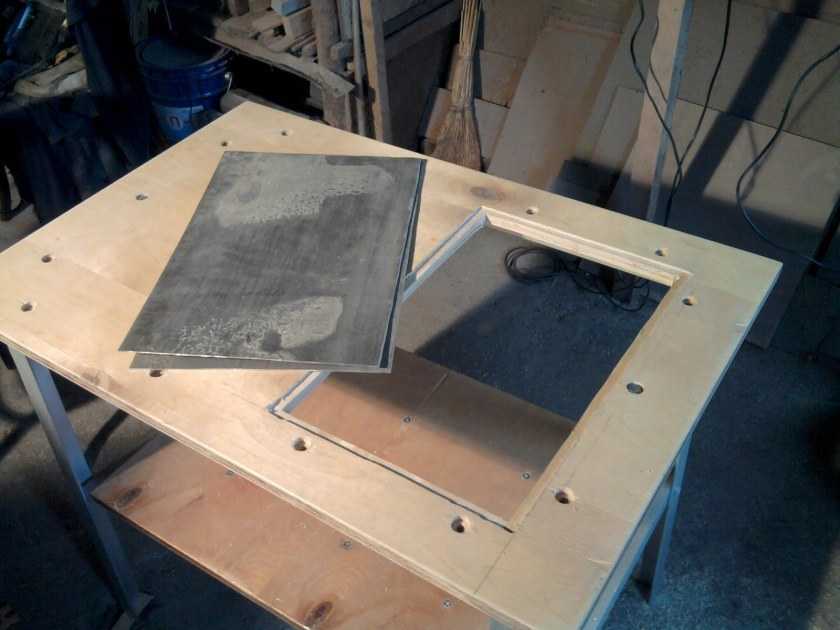 Посредине столешницы делают прямоугольное окно, которые затем закрывается вставкой из дюралюминия или оргстекла с прорезью для диска. Такая вставка позволяет обеспечить плавное перемещение обрабатываемой доски или листа вдоль линейки.