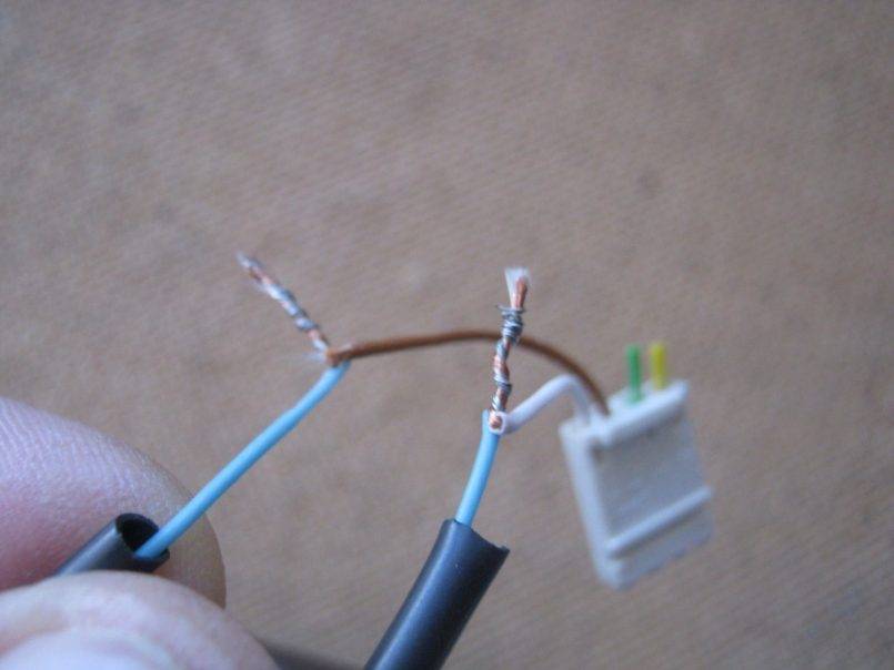 - Соединить провода методом скрутки, накрутив один на другой так, чтобы концы были на уровне друг друга. Рекомендуется делать длину не меньше 50 мм.