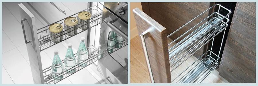 Кроме того, у них есть и другие виды конструкций, отличающиеся размерами, от стандартных бутылочниц. Они значительно больше, выглядят как целые корзины (с шириной корпуса 200-400 мм), способные вместить больше элементов.