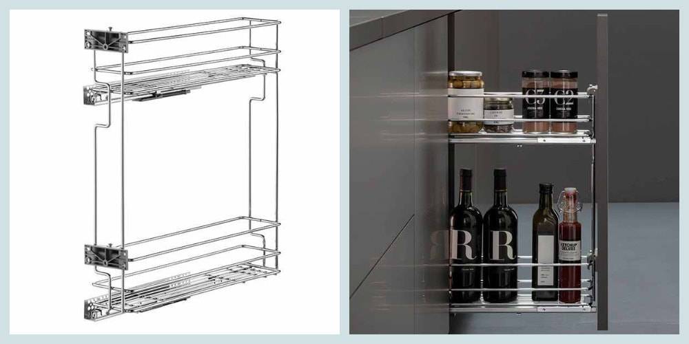 Бутылочница (ее часто называют карго) – это обычно корзинка из прочных металлических прутьев, которая имеет выдвижной механизм и ограничители, которые нужны для безопасного расположения продуктов, различных бутылок, специй или полотенец. Предназначение такой конструкции — хранение определенных емкостей в одном месте, потому ее и размещают ближе к кухонной плите, а многие конструкции устанавливаются даже по обе стороны от нее.