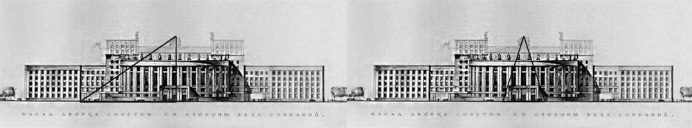 Золотой прямоугольный треугольник идеально вписывается в центр здания, его вершина совпадает с вершиной Дома Советов, а гипотенуза заканчивается в конце бокового крыла. Если построить равнобедренный золотой треугольник, его грани будут проходить через точки в верхней части основного входа.