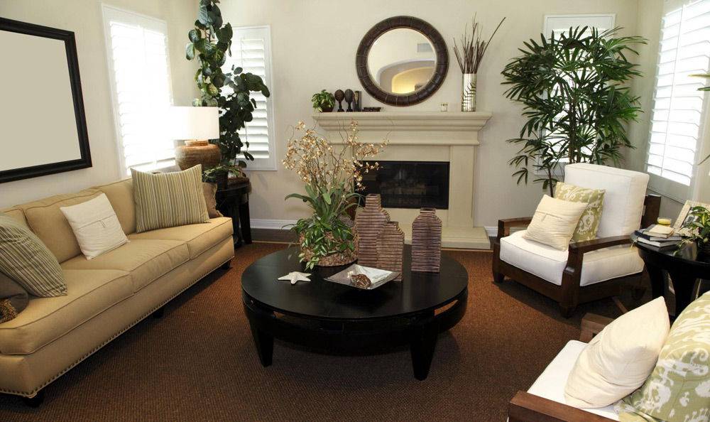Цветы в гостиной, дизайн которой вы планируете заранее, должны гармонировать с поверхностью, на которой будут размещены: