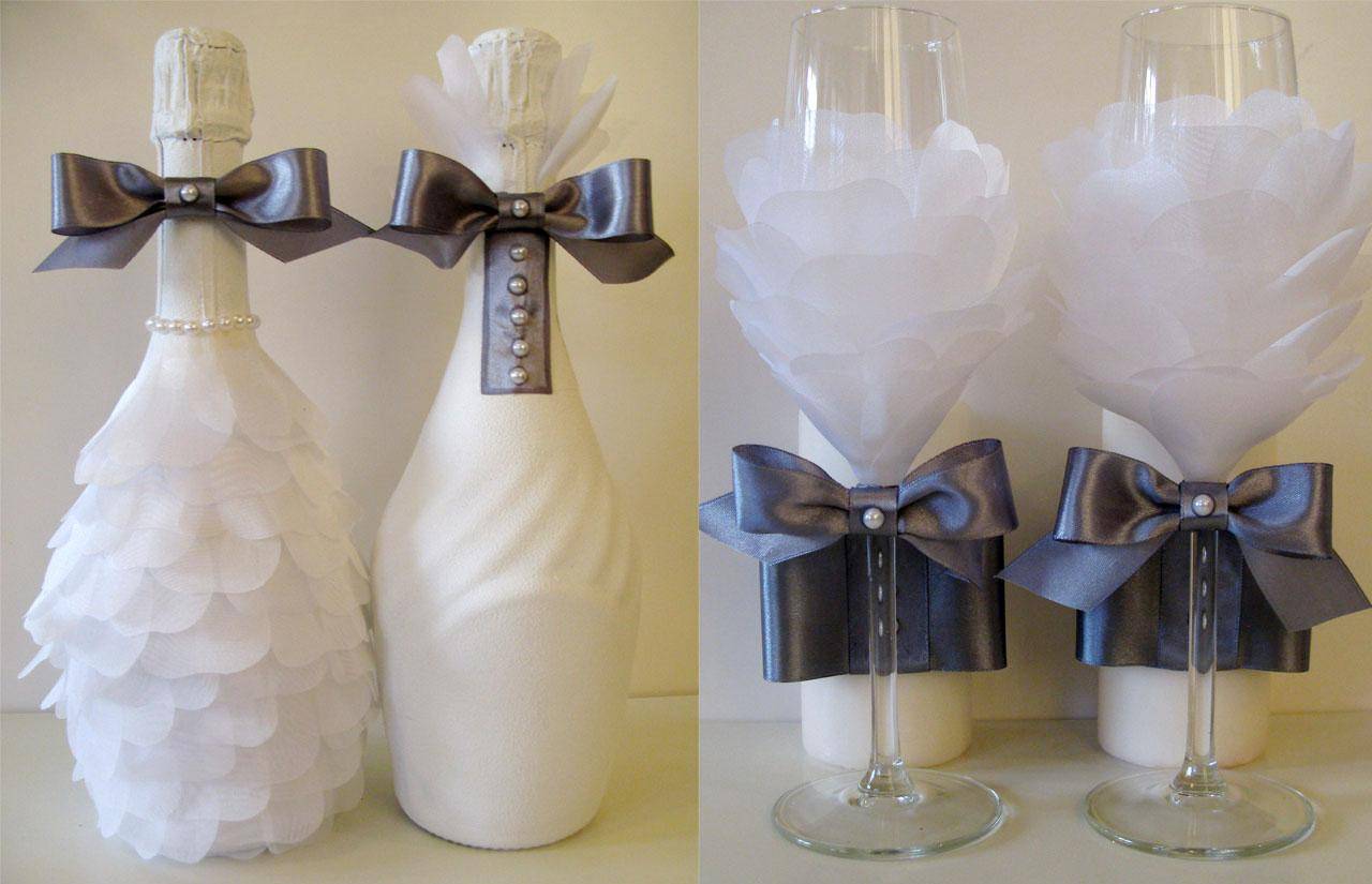 Начинать нужно с измерений бутылки для определения размера ленты. Далее следует приложить отрезки к месту приклеивания (чтобы прикинуть, как они будут смотреться). Убрав излишки, приступают к клеевой разметке бутылки: на ее поверхности ставятся небольшие точки в тех местах, где будет размещаться атласная лента.