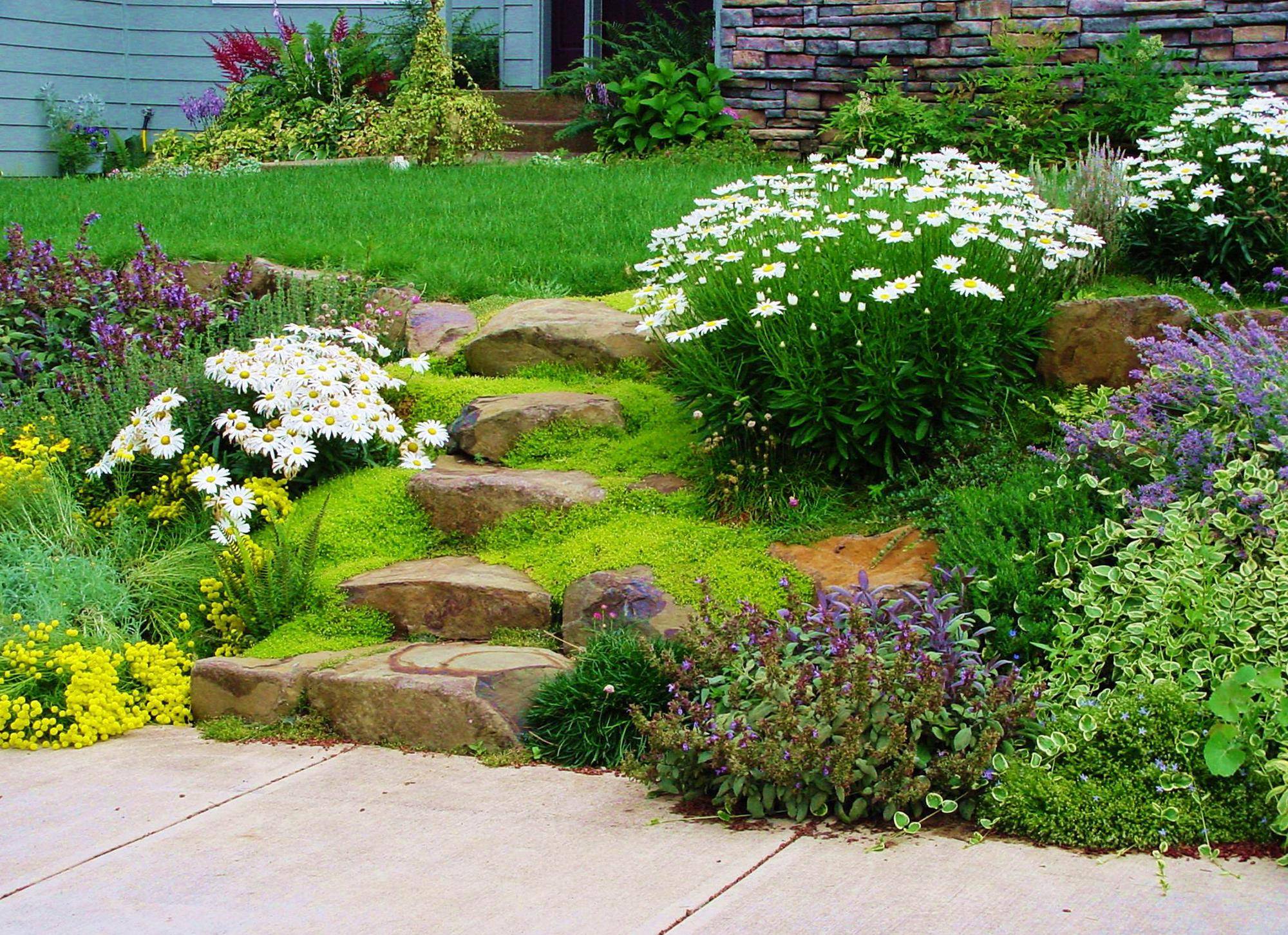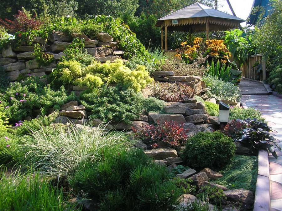 При оформлении сада камнями важно соблюдать баланс, если, конечно, вы не собираетесь превращать участок в японский сад камней, где кроме этого материала на всей территории сложно что-либо отыскать. Оптимальный вариант для использования камней в декоре сада — установить пару-тройку крупных валунов в районе альпийской горки и водоёмов, а средними и мелкими камнями оформить дорожки и берег пруда