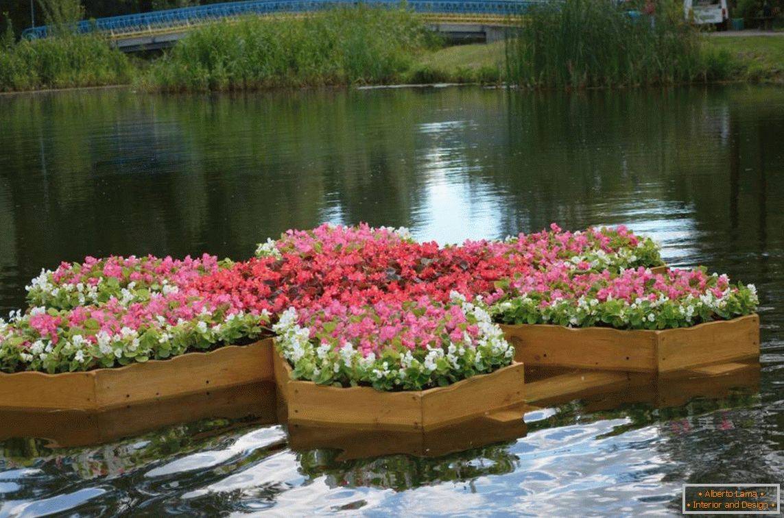 Дуже стильно і красиво виглядає такий декоративний елемент водойми, як плаваюча клумба. Зелений острівець з квітів можна спорудити своїми руками. Досить зробити міцне дерев’яна підстава з вологостійким просоченням, на яке поміщається ущільнююча сітка і земля, і висадити на цей пліт рослини.