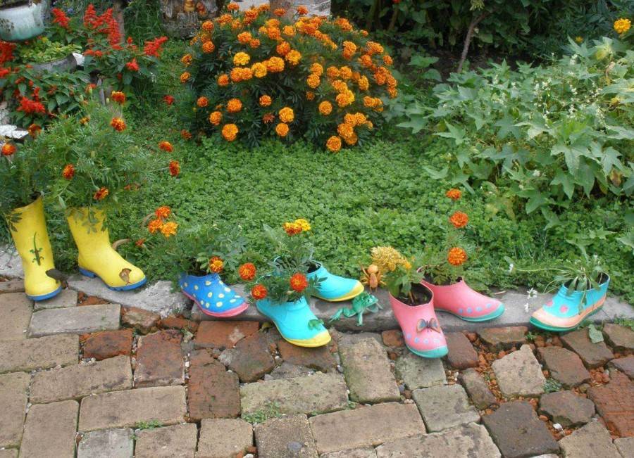 - Прохудившаяся обувь – здесь может пойти в ход абсолютно все: старые колоши, ботинки, шлепанцы, туфли-лодочки или джинсовые кеды. Можно красиво покрасить обувь вместе со шнурками, приклеить яркие декоративные элементы и посадить внутрь живые цветы. Поэтому во время ревизии старых вещей стоит несколько раз подумать, если хотите украсить свой дачный участок.