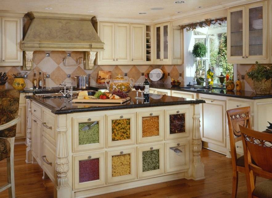 В качестве объектов декора в кухне используют расписанную керамику, деревянные разделочные доски, сухие букеты, вазы с фруктами, зелень в горшочках и другие. Главное все это разместить так, чтобы не мешало основному занятию – приготовлению пищи.