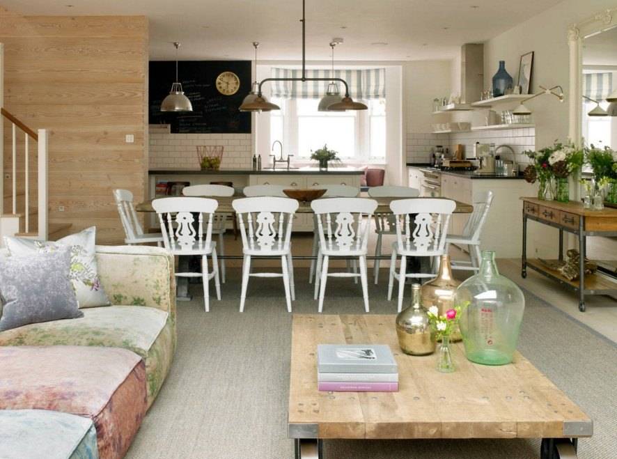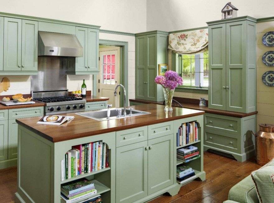 Деревенская стилистика подходит в интерьер кухни в частном доме или даче. Но владельцы квартир, которым нравится уютная сельская обстановка тоже используют его. Мебель должна быть простых форм, декорирование фасадов и прочих элементов должно быть под старину. Открытые полки, ниши заполняют различными баночками, подходящими к тематике. Шторы и другой текстиль берут в клетку. Дополняют композицию плетеными корзинами с хлебом и фруктами.