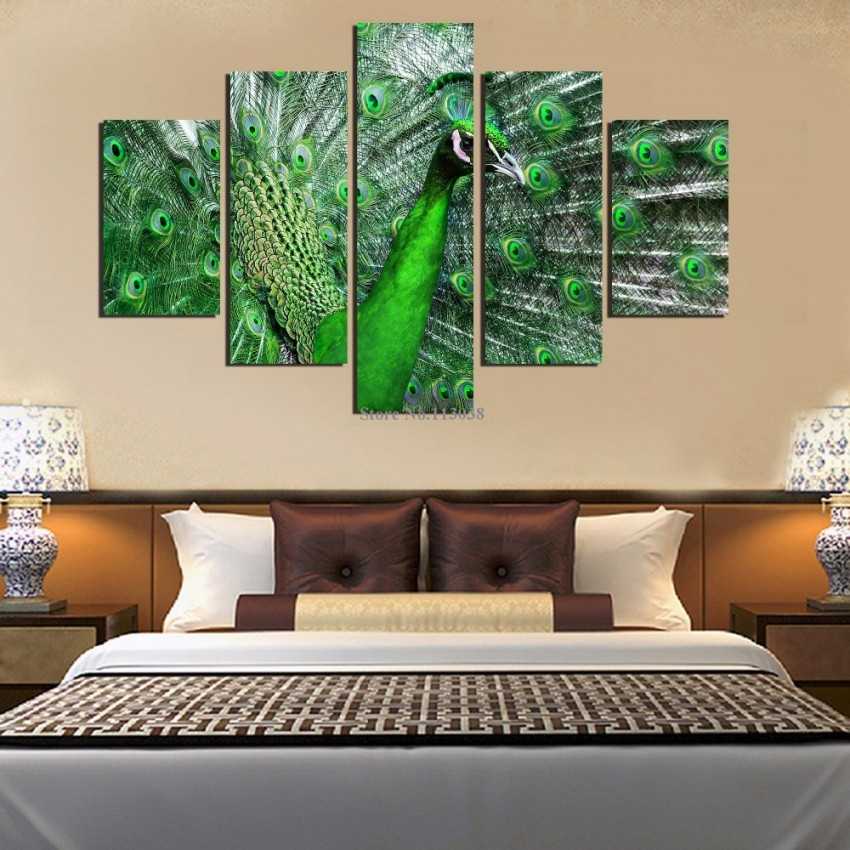 На стене над кроватью лучше разместить большую по размерам картину, либо несколько маленьких. Современно будут смотреться пустые рамки различных величин. Возле них можно развесить сделанные своими усилиями объемные бумажные поделки.