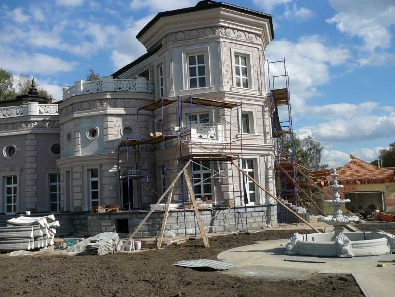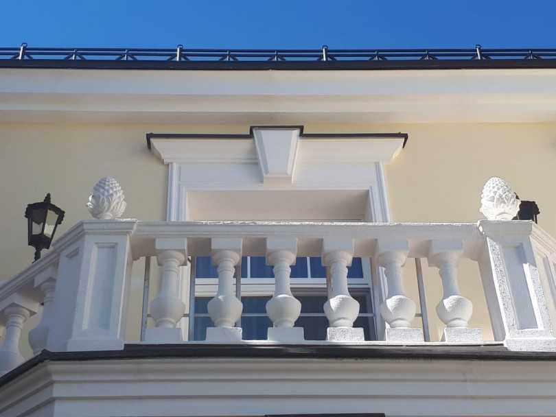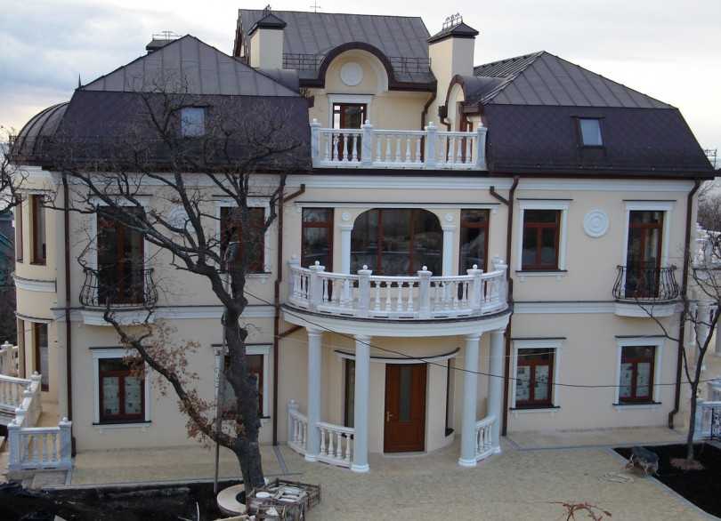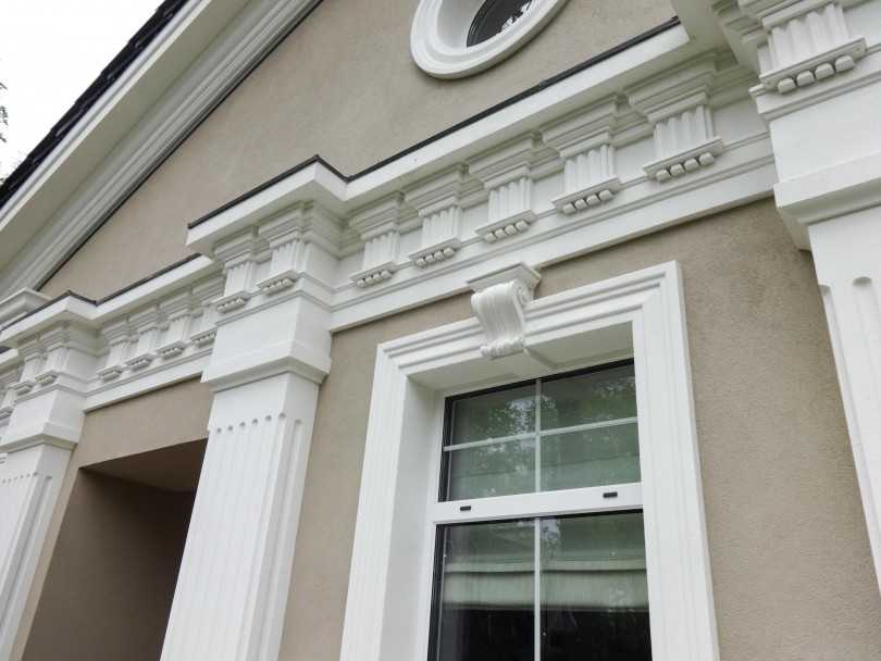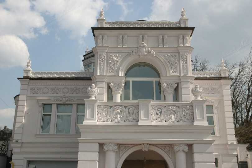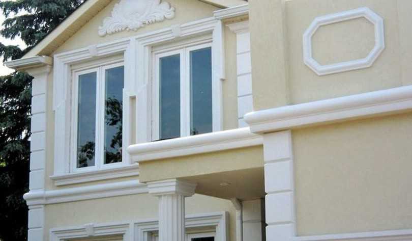 Лучше других в качестве фасадного декора зарекомендовал себя пенополиуретан. Это плотный и устойчивый к внешним воздействиям материал. Он долговечнее пенопласта, но отличается от него более высокой ценой. Фасадный декор из пенополиуретана не впитывает влагу, не трескается и не крошится. Срок службы лепнины, изготовленной из этого полимера, достигает 30 лет, а весь уход за ней состоит в периодическом подкрашивании (1 раз в 10 лет).