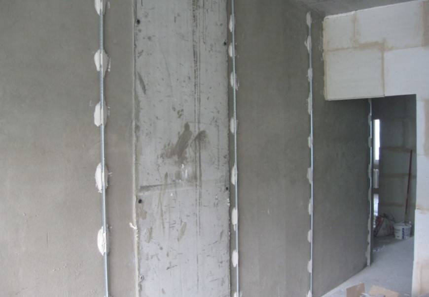 Иногда может понадобиться 2 слоя грунтовки. Далее приступают к установке маячков и нанесению штукатурки.