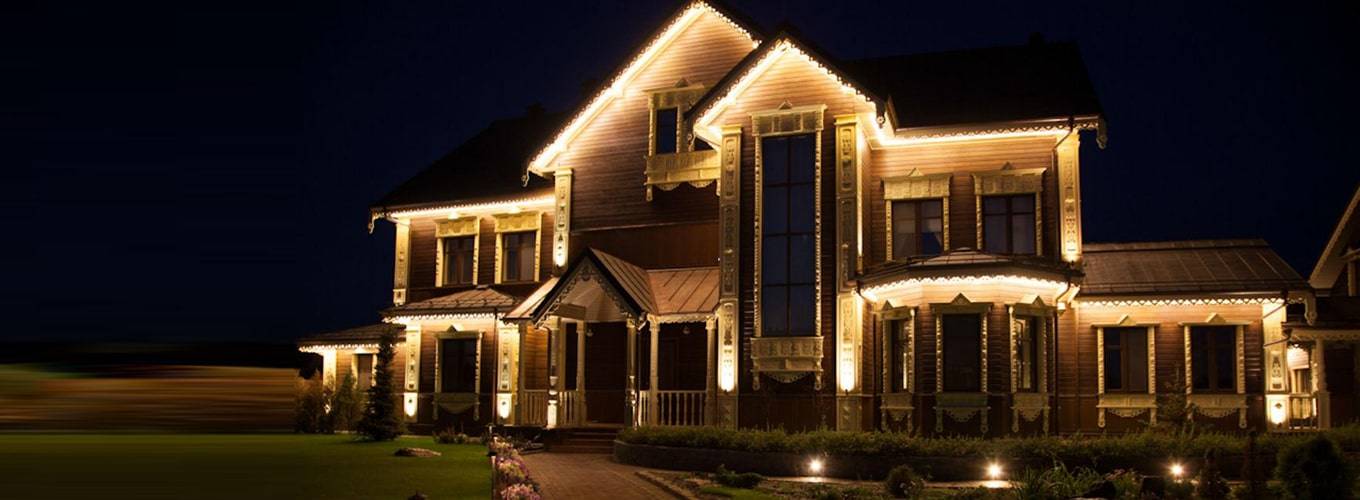 Невозможно создать световые декорации, просто развесив на фасаде загородного дома лампочки или светильники. Проектом должен заниматься специалист, как и техническими работами в его рамках.