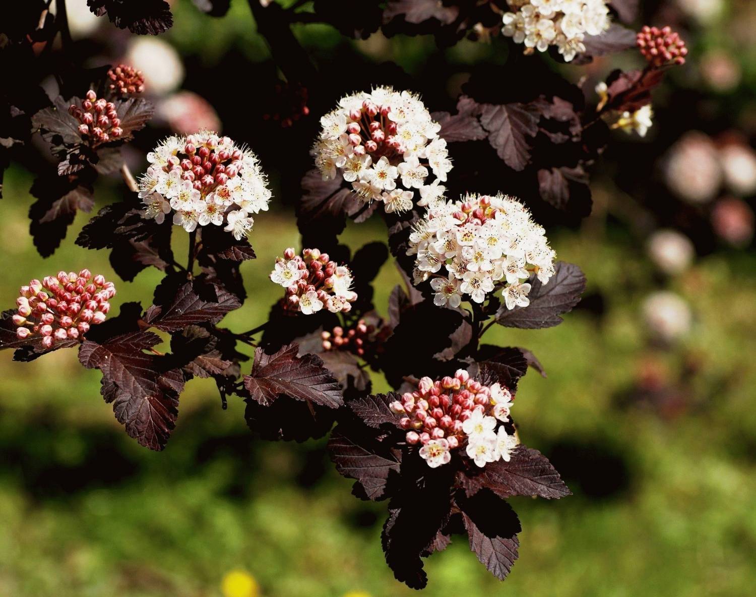 Кустарник из семейства Розовых известен способностью наращивать побеги до 40 см в длину за сезон. Без формирующей обрезки кусты вытягиваются до 3 м в высоту. Яркая листва насыщенного фиолетово-бордового цвета в сочетании с пышными щитками из мелких белых цветочков выглядит очень декоративно.