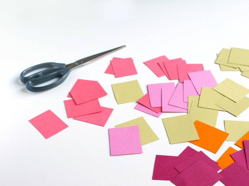 Цветную бумагу разрезаем на прямоугольники одинакового размера.