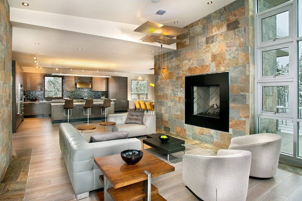 Способы декорирования камнем выступов, ниш и каминов в гостиной