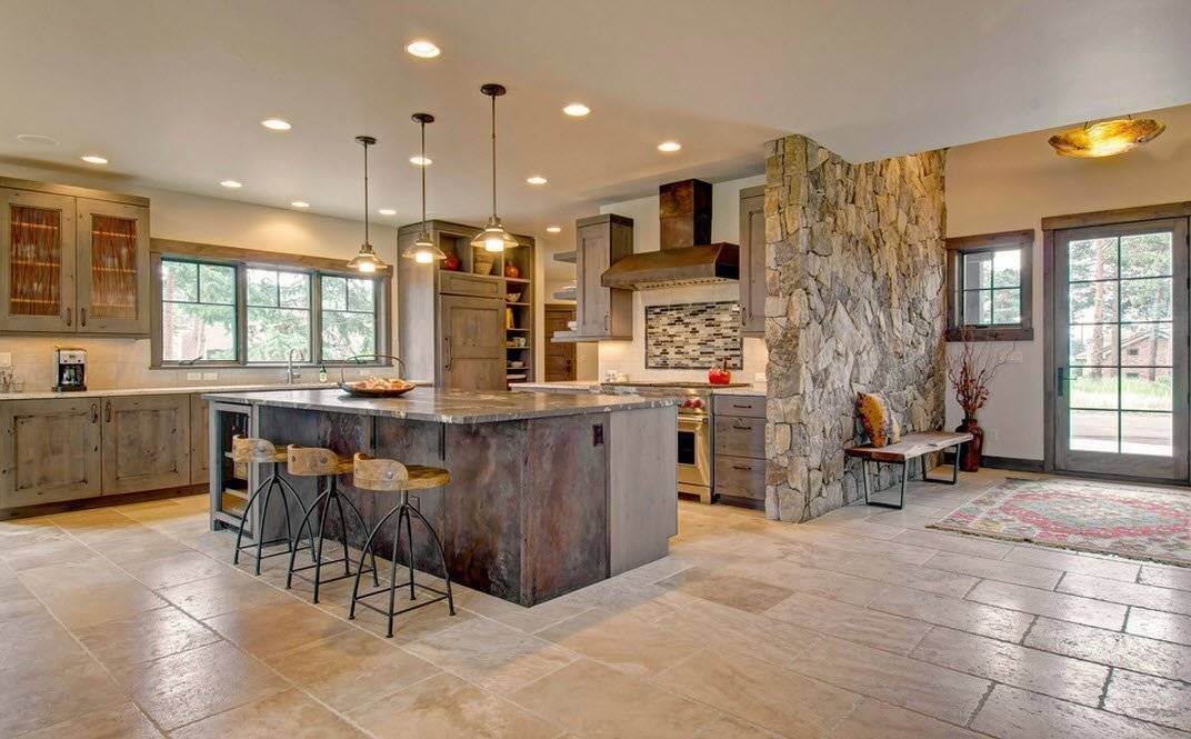 Шале подразумевает сочетание грубого дикого валуна, гальки с громоздким деревянным потолком в темно-коричневом и сером цвете. Такой стиль можно создать только в просторной кухне с большими окнами.