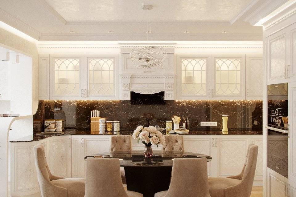 Классический стиль допускает облицовку только из природных дорогих пород в желтом, коричневом, белом цвете. Плоская кладка или панели из оникса, мрамора украсит фартук и стену у обеденного стола.
