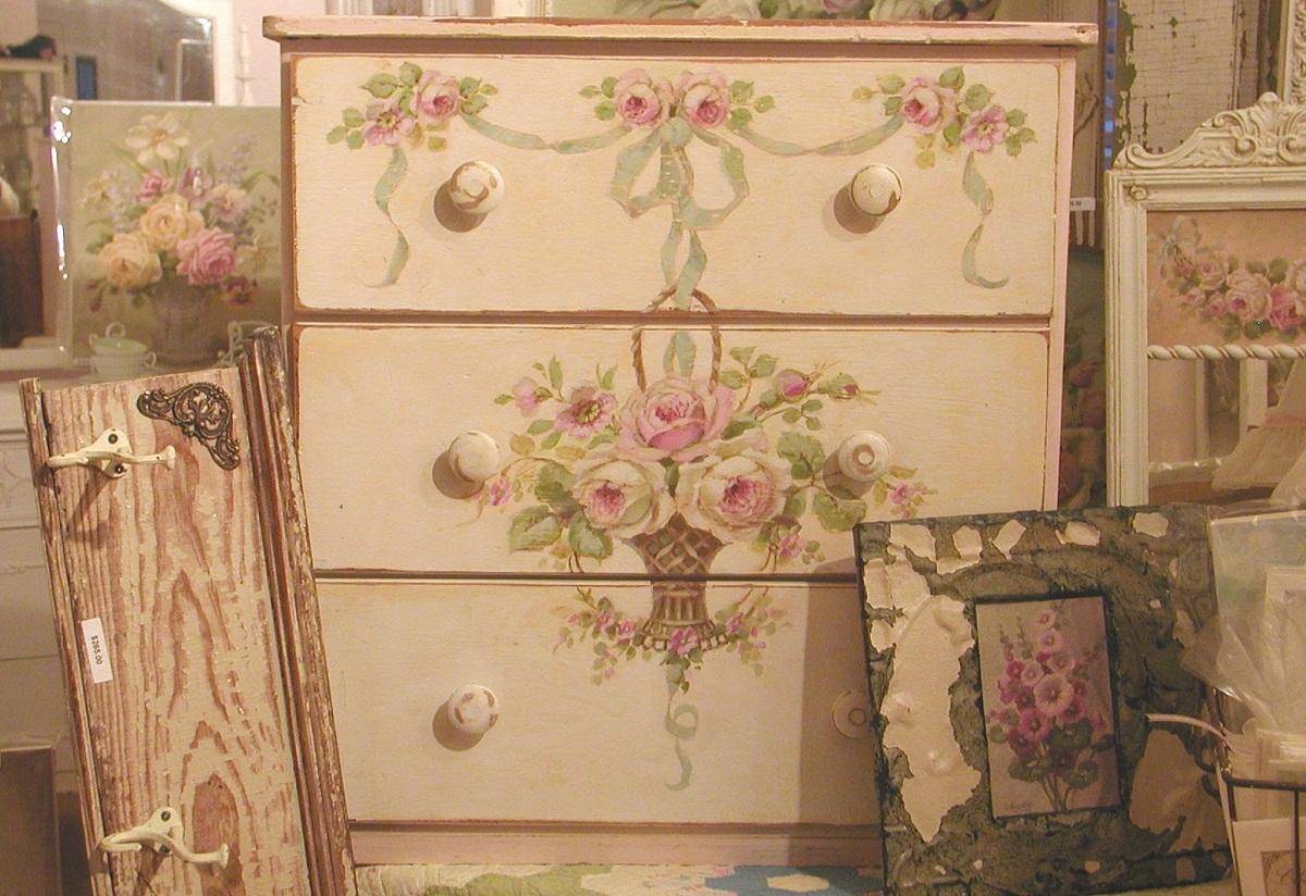 Шебби-стиль. Имитирует собой антикварную вещь. Поверхность декорируется не полностью, а отдельными элементами. Границы картинок обычно размыты и сливаются с фоном.