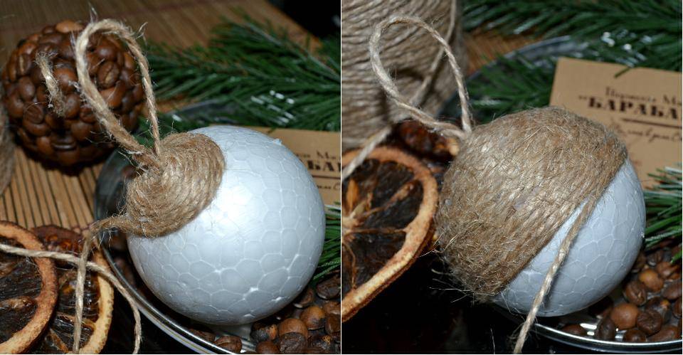 Для оформления игрушки в этническом стиле понадобится джутовый шпагат, узкое кружево из хлопка и клей ПВА. Для начала приклейте к шару хвостик шпагата.