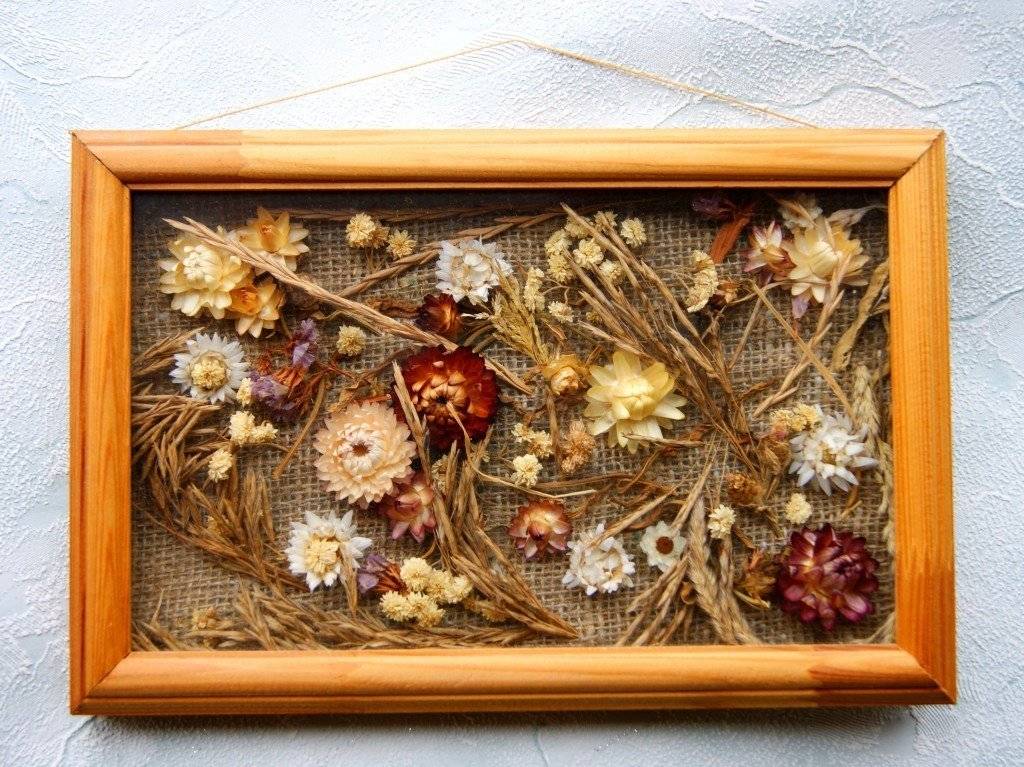 Если панно будет накрываться стеклом, используют пластиковые или деревянные рамки. Плотные основы спокойно выдержат утяжеляющие композицию элементы. Под влиянием эко-течения многие мастера для создания настенных украшений из сухоцветов используют мешковину. Текстура материала позволяет использовать для крепления цветов не только клей, но и нитки, проволоку.