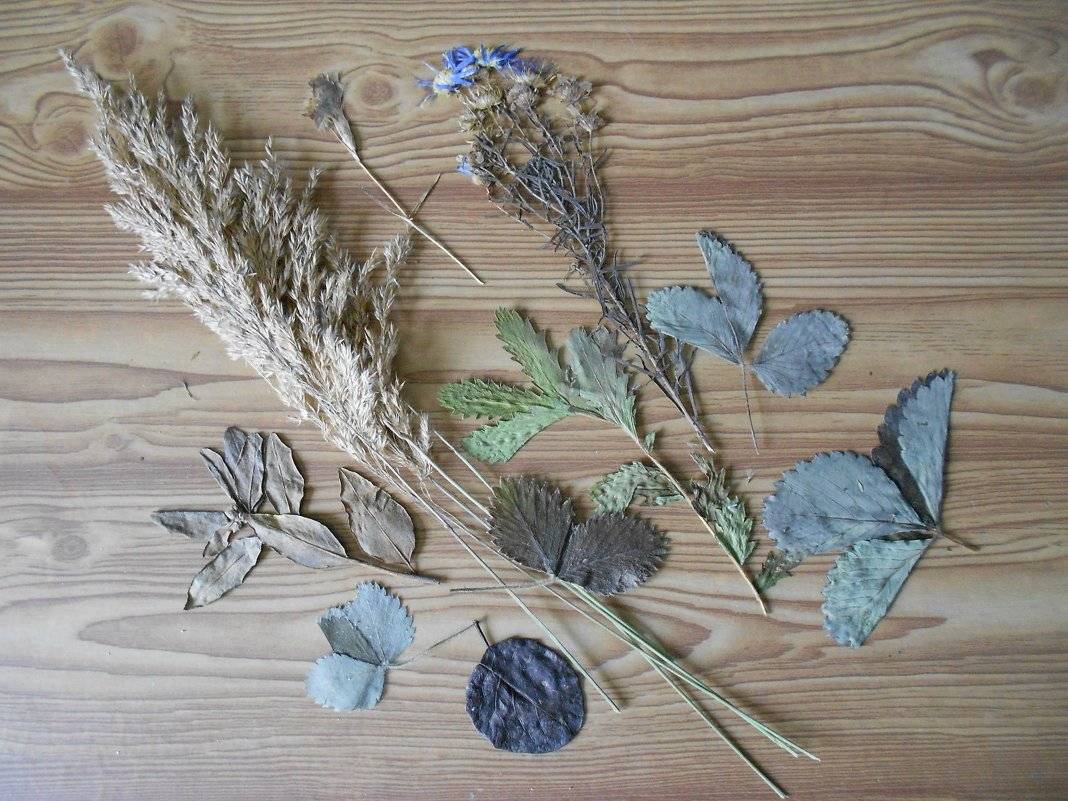 - Гербарий – плоские растения высушивают, поместив под пресс, которым можем выступать, например, книга или доска;