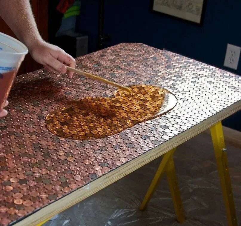 Расположив все нужные элементы на поверхности по задуманным местам, переходят непосредственно к заливке смолы. Ведь она застывает быстро. Выливать готовый раствор, нужно начиная с середины, так он равномерно будет распределяться по поверхности. Если стол делается большой, то заливку расширяют. Проведя заливку всего состава, его выравнивают с помощью гладилки. После выравнивания оставляют изделие высыхать.