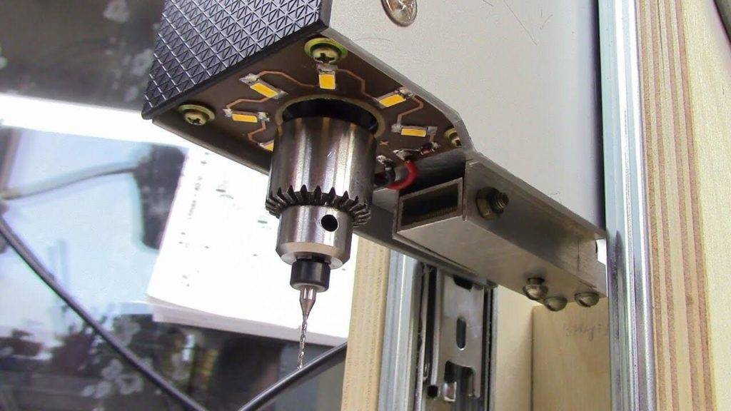Это очень важный момент. Именно от выполнения данного требования напрямую зависит точность сверления самодельного станка. Поэтому если вы намерены сделать его своими руками, позаботьтесь и о точном измерительном инструменте. Не менее важна и надежность крепления дрели. Если инструмент будет вилять во время работы, это негативно повлияет на ее качество. Самый простой вариант – прикрепить дрель к стойке с помощью нескольких алюминиевых хомутиков. Более сложный вариант – изготовить специальную каретку. Впрочем, здесь ничего особо сложного нет. Если вы не хотите долго возиться с этой частью самодельного станка, то можно пойти по самому простому пути – подобрать металлическую или деревянную пластину и проделать в ней отверстие, в которое будет вставляться дрель.