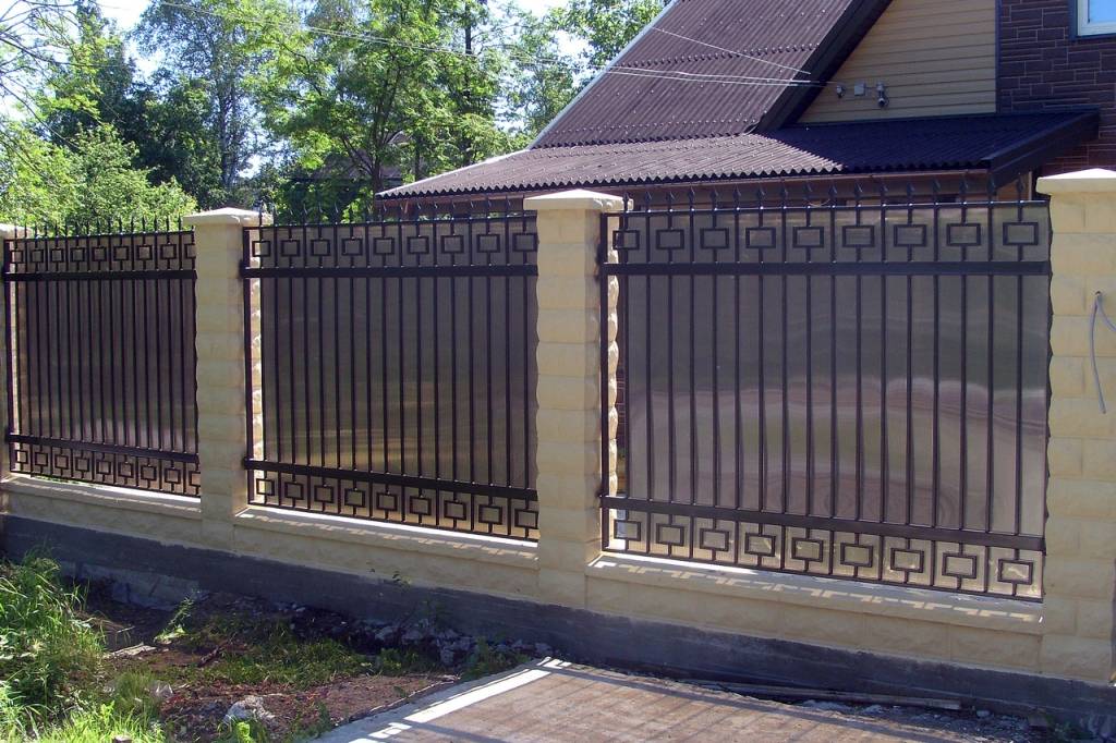 Забор из поликарбоната обычно устанавливается в обрамлении металлического каркаса или в сочетании с коваными элементами. Во втором случае решается проблема видимости того, что происходит во дворе со стороны улицы, а забор не теряет изящности и оригинальности. Достоинствами ограждений из поликарбоната являются светопроницаемость, разнообразие расцветок, защита от ветра, хорошая шумоизоляция.