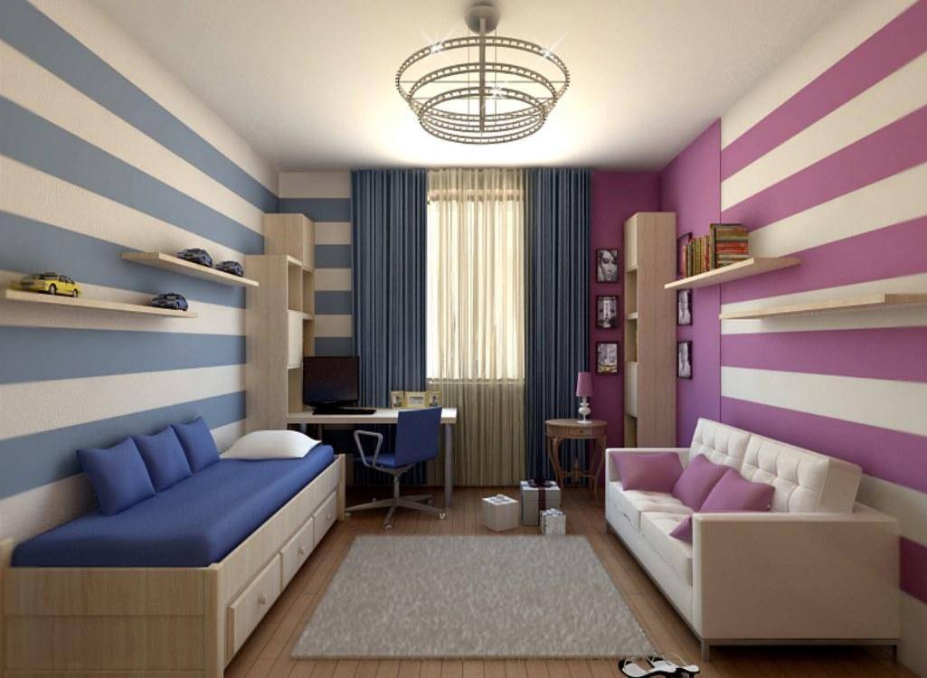 - Универсальные принты и рисунки. Если у детей есть большая разница в возрасте, то желательно, чтобы детали интерьера (обои, шторы, покрывала и пр.) имели универсальные принты и рисунки. Так, например, в комнате, где живут подросток и два малыша, стоит поклеить обои не с феями или машинками, а в полоску, клетку, зигзаг или, скажем, в звездочку.