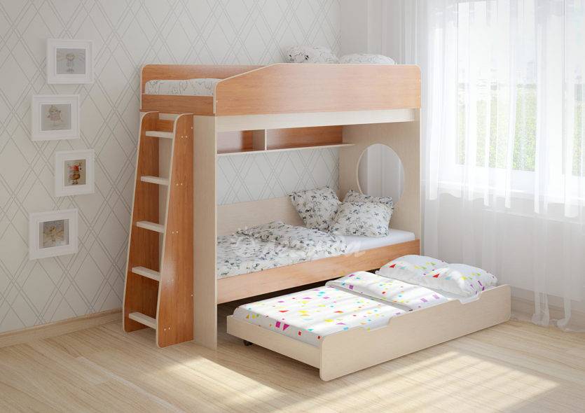 Самым главным и обязательным элементом детской для троих считается кровать. Для небольшой комнаты можно использовать трехъярусную модель или двухъярусную конструкцию с выкатной кроватью, в случае достаточного количества места в одной комнате, предпочтительней установить три отдельных односпальных ложа, диваны или кушетки с п-образным, г-образным, параллельным или линейным размещением.