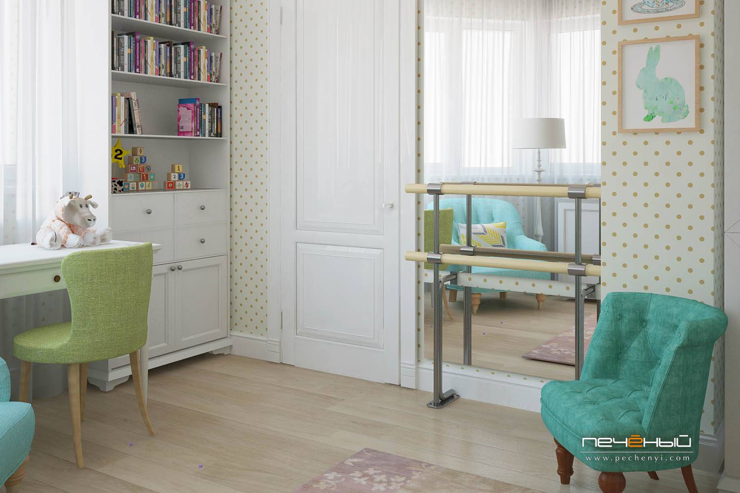 В большинстве случаев для оформления стен в детских комнатах используют обои. Беспроигрышный вариант — горошек, полоска, милые рисуночки. Юная хозяйка этой комнаты занимается балетом. Чтобы ей было удобно тренироваться дома мы предусмотрели в комнате большое зеркало и балетный станок.